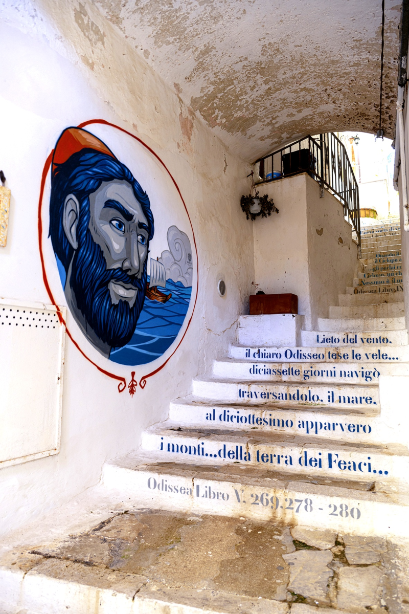 I vicoli stretti, le scale e i passaggi ad arco creano continuamente scorci che incorniciano il mare.